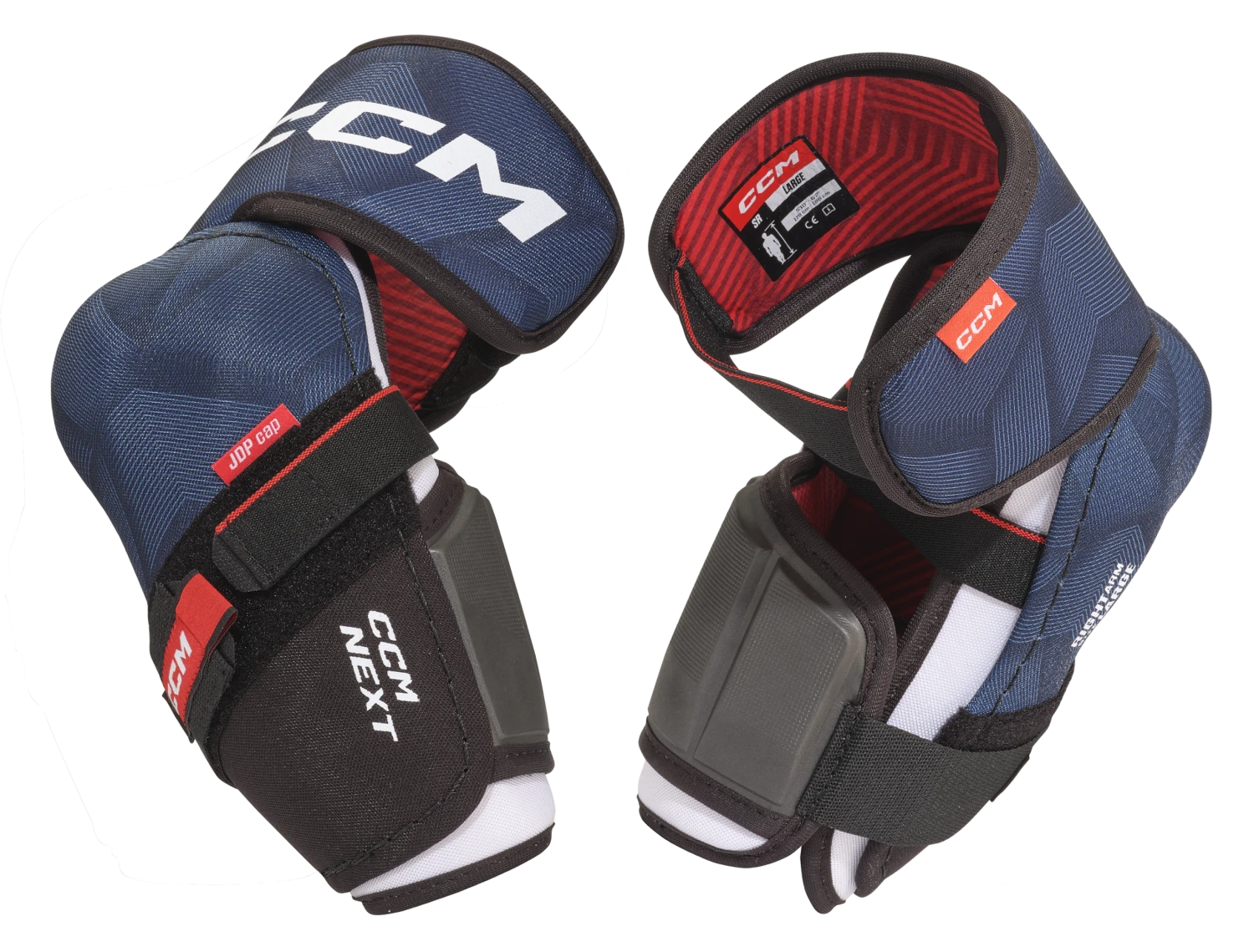 JDP construction designed to disperse impact force away from the elbow joint while comfort and fit are enhanced by donut padding.